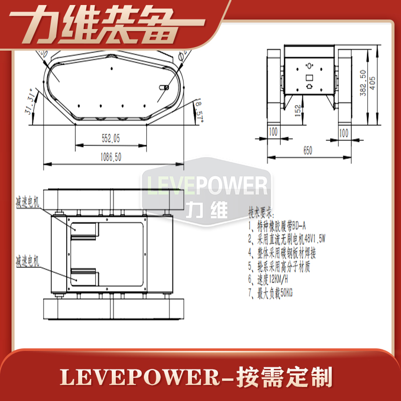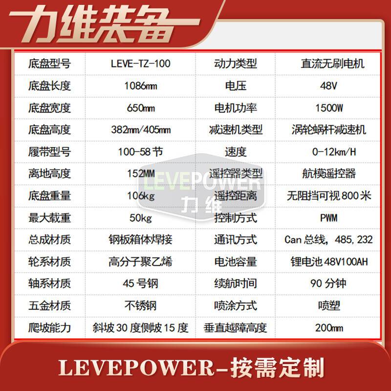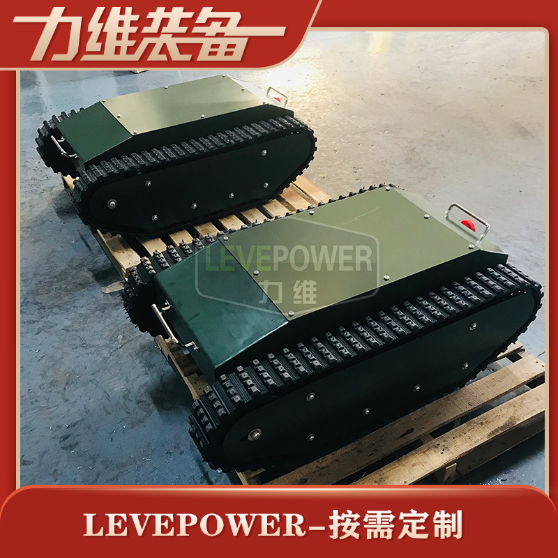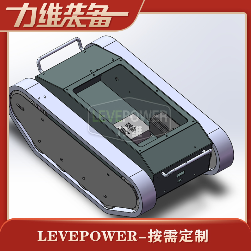 特種橡膠履帶底盤長(zhǎng)1086mm,履帶底盤寬650mm,履帶底盤高382mm,無(wú)線遙履帶底盤搭載48V1500W直流無(wú)刷電機(jī),RV50渦輪蝸桿減速機(jī),動(dòng)力更強(qiáng)。履帶底盤采用48V100AH鋰電池,續(xù)航時(shí)間90分鐘。履帶底盤框架采用鋼板箱體焊接而成,底盤承載力大,是一款全地形履帶底盤。