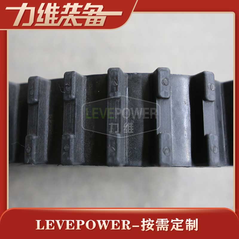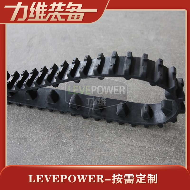 此履帶為撥齒履帶,外花紋采用矩形橫紋設計,內齒采用節距適中的三角塊狀設計,帶體較厚,此款設計提高了履帶自身的載重能力,和抓地力是一款適合用于機器人底盤的配套履帶。