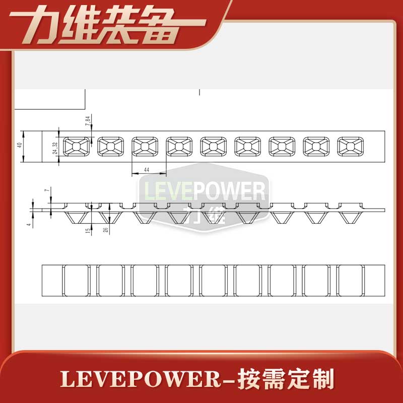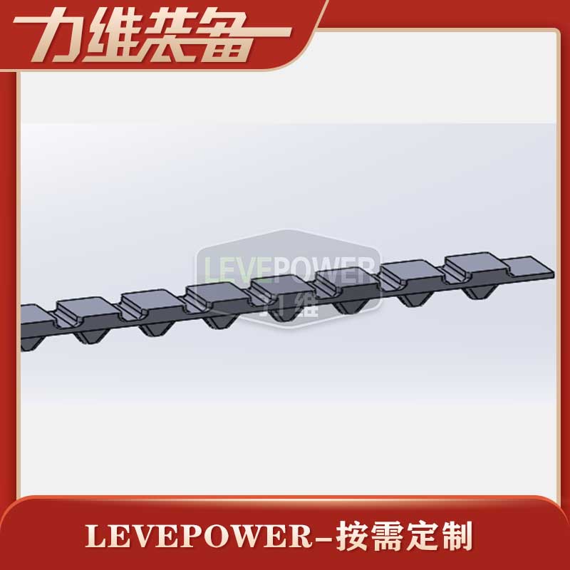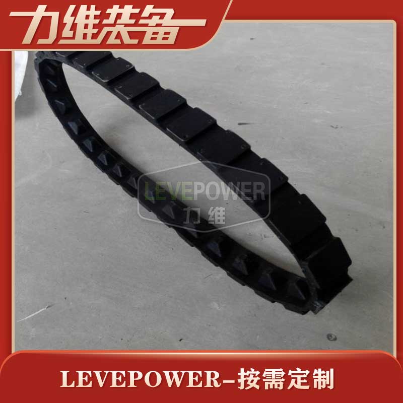 此履帶為撥齒履帶,外花紋采用方塊矮齒緊密設計,內齒采用節距適中的三角塊狀設計,帶體較厚,此款設計提高了履帶自身的載重能力,實現了在路面行駛非常平穩功能。