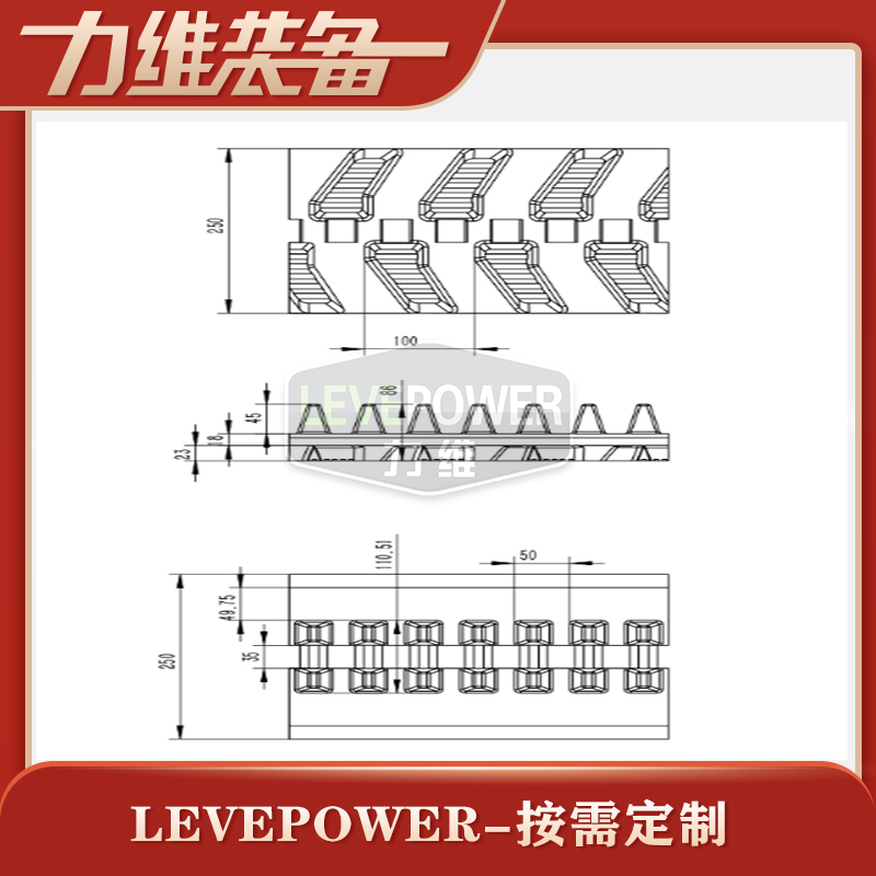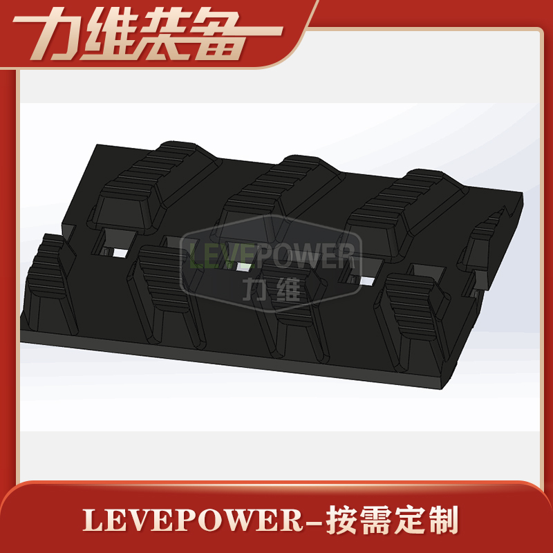 此履帶為插齒履帶,外花紋采用對(duì)稱塊狀八字設(shè)計(jì),提高履帶自身的接地面積和抓地能力,內(nèi)齒采用雙內(nèi)齒梯形高齒結(jié)構(gòu)設(shè)計(jì),內(nèi)置高強(qiáng)度鑄鋼件,提高履帶的使用壽命。此款產(chǎn)品帶體較厚,是一款全地形橡膠履帶。