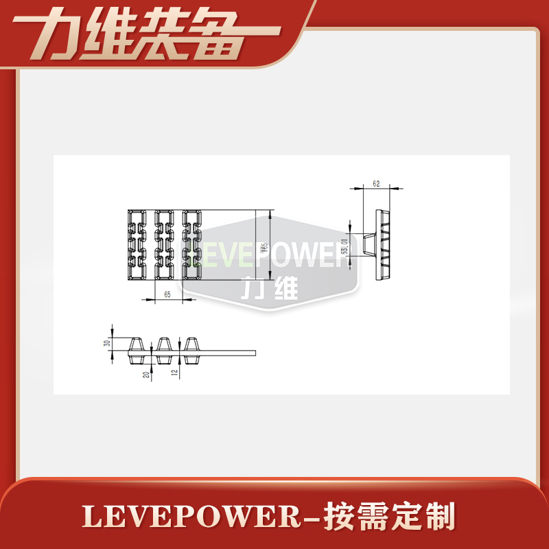 此款特種橡膠履帶外花紋采用大方格排序橫紋高齒間接設計,內齒采用大梯形高齒的設計,此款履帶適合中型底盤系統使用。