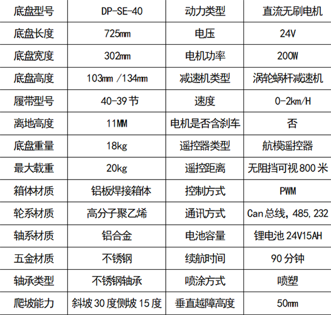橡膠履帶底盤長(zhǎng)700mm左右,履帶底盤寬340mm左右,履帶底盤高110mm左右,整車采用6061鋁合金箱體焊接,材質(zhì)輕,耐腐濁,履帶車搭載24v200W直流永磁無刷電機(jī),渦輪蝸桿減速機(jī),動(dòng)力強(qiáng),體積小,防水性能好,越野性能強(qiáng),可用于管道清淤,偵查、巡檢等場(chǎng)景。