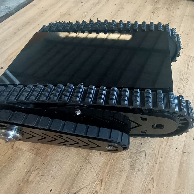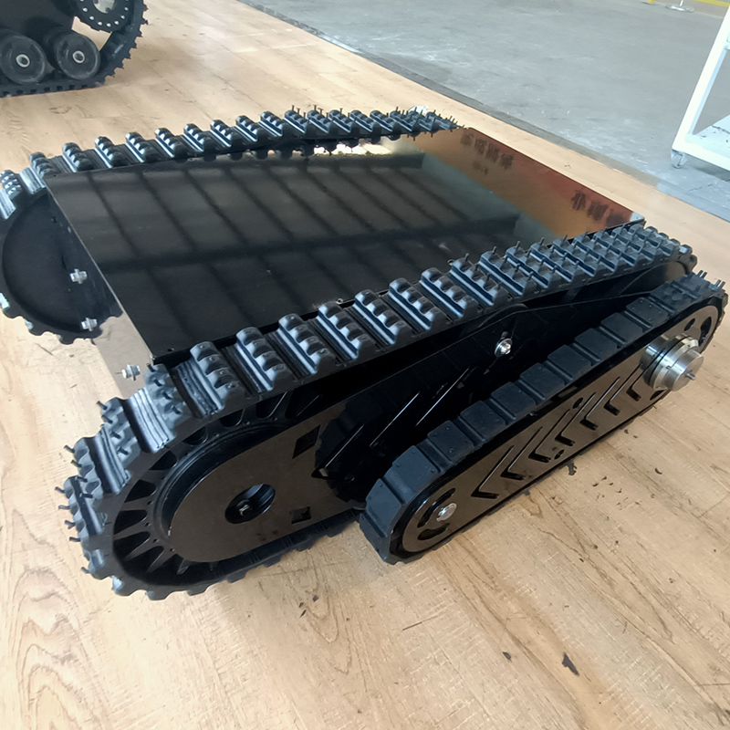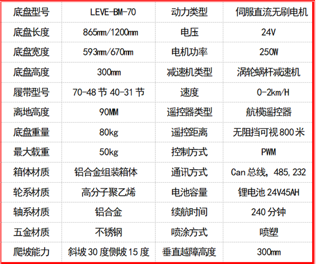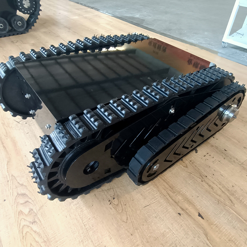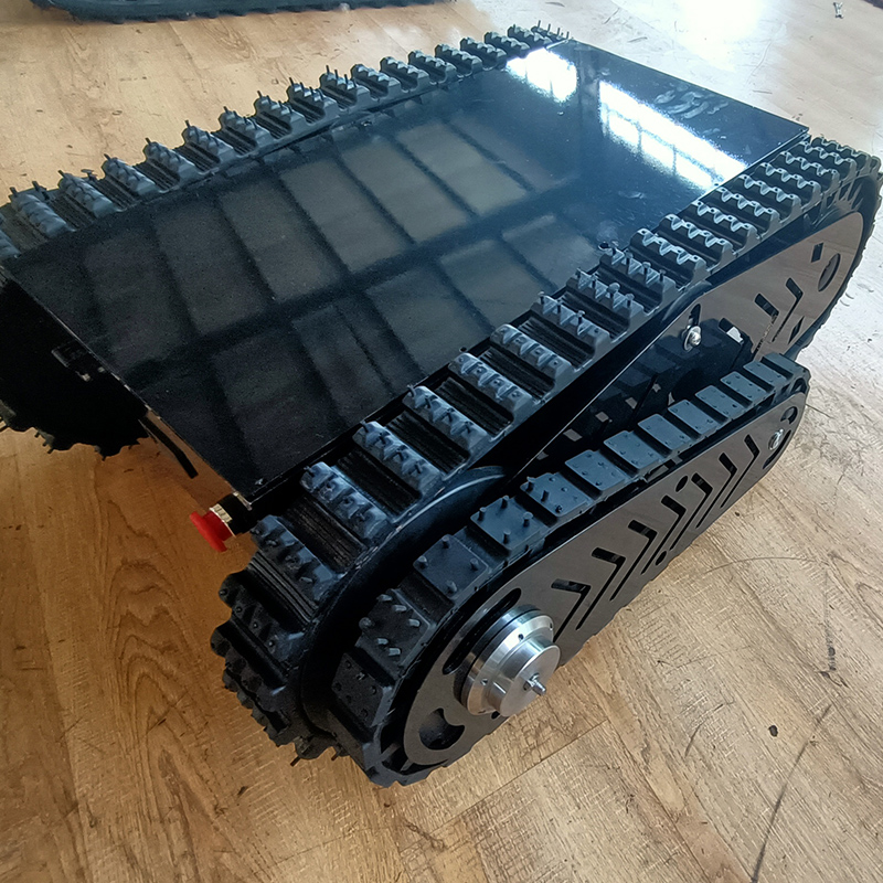 該底盤主體履帶使用100mm寬耐磨橡膠履帶,外花紋橫紋設計,提高攀爬能力。擺臂履帶采用40mm寬度機器人橡膠履帶,底盤箱體經過高溫噴砂噴塑防銹處理,主題底盤采用2個24v200w伺服直流無刷電機,擺臂采用1個24v200w伺服直流無刷電機,渦輪蝸桿減速機,可載重50kg,是一種操控既方便,有實用的底盤系統,在不平坦的路面,爬坡,越障非常好用。是一款全地形底盤。電池采用磷酸鐵鋰鋰電池,持續續航時間可達4個小時長時間續航。
