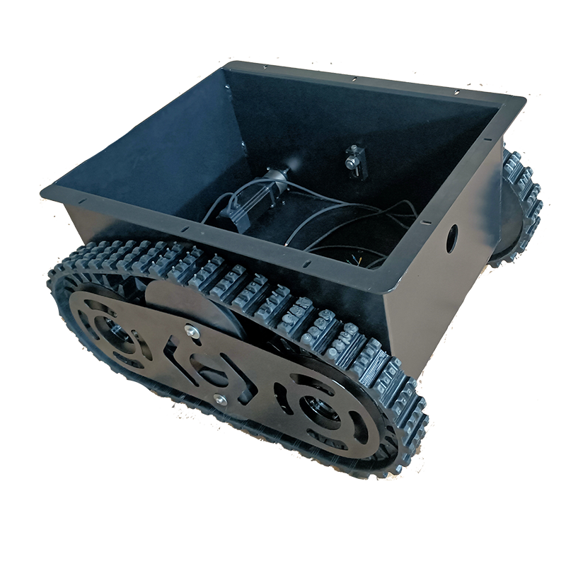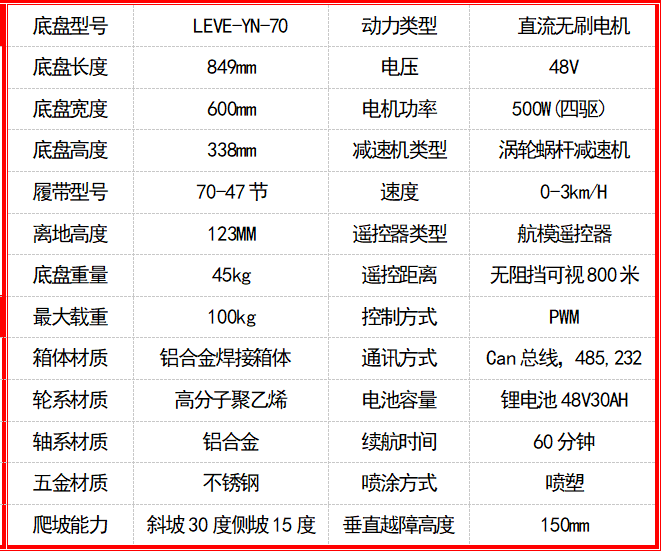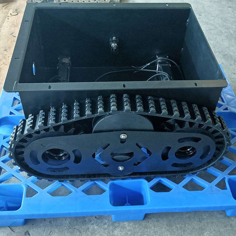橡膠履帶底盤長849mm,履帶底盤寬600mm,履帶底盤高338mm,無線遙控履帶底盤搭載48V500W直流永磁無刷電機,RV渦輪蝸桿減速機動力更強,爬坡更有勁。